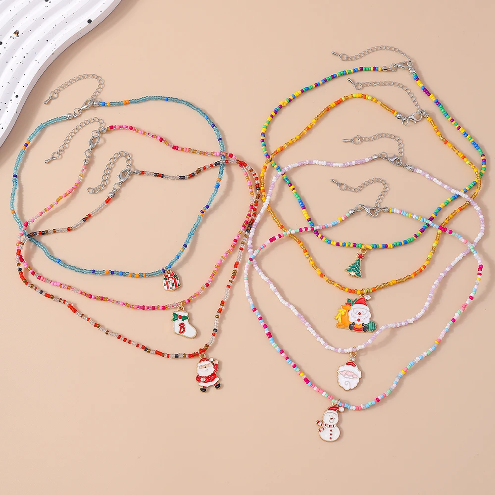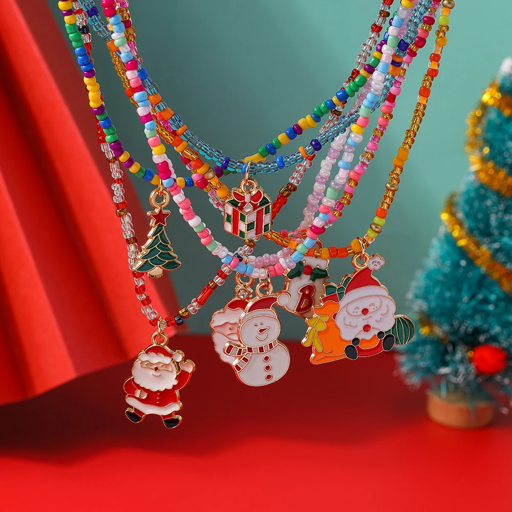7pcs/Set Christmas Necklaces for Women Girls X'mas Tree Santa Claus Snowman Beads Necklace Pendant New Year Jewelry Gift