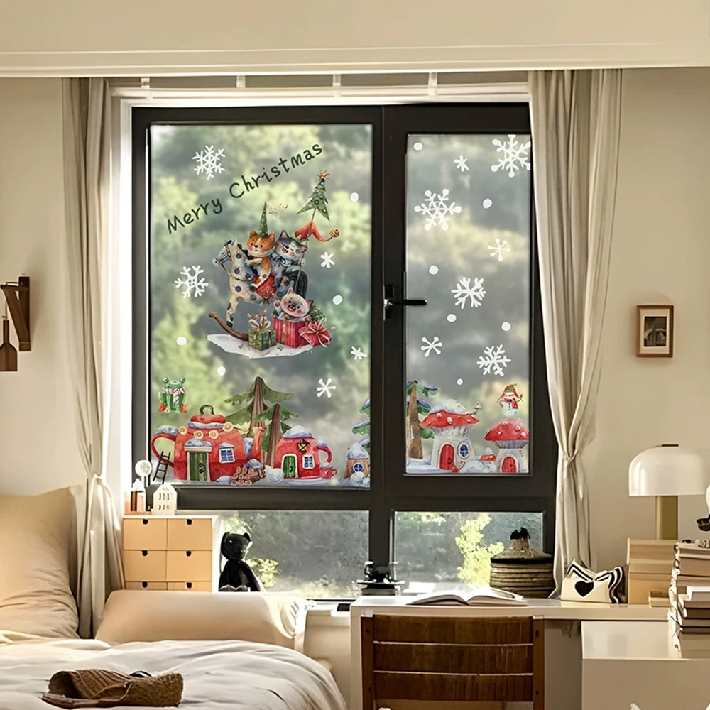 Double-Sided Christmas Window Clings Stickers for Glass, Winter Cabin in Snowy Forest Static Cling Decal for Xmas Home Decor