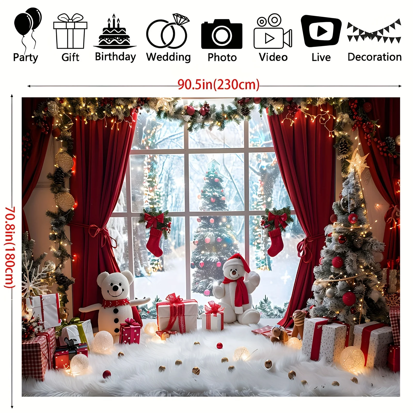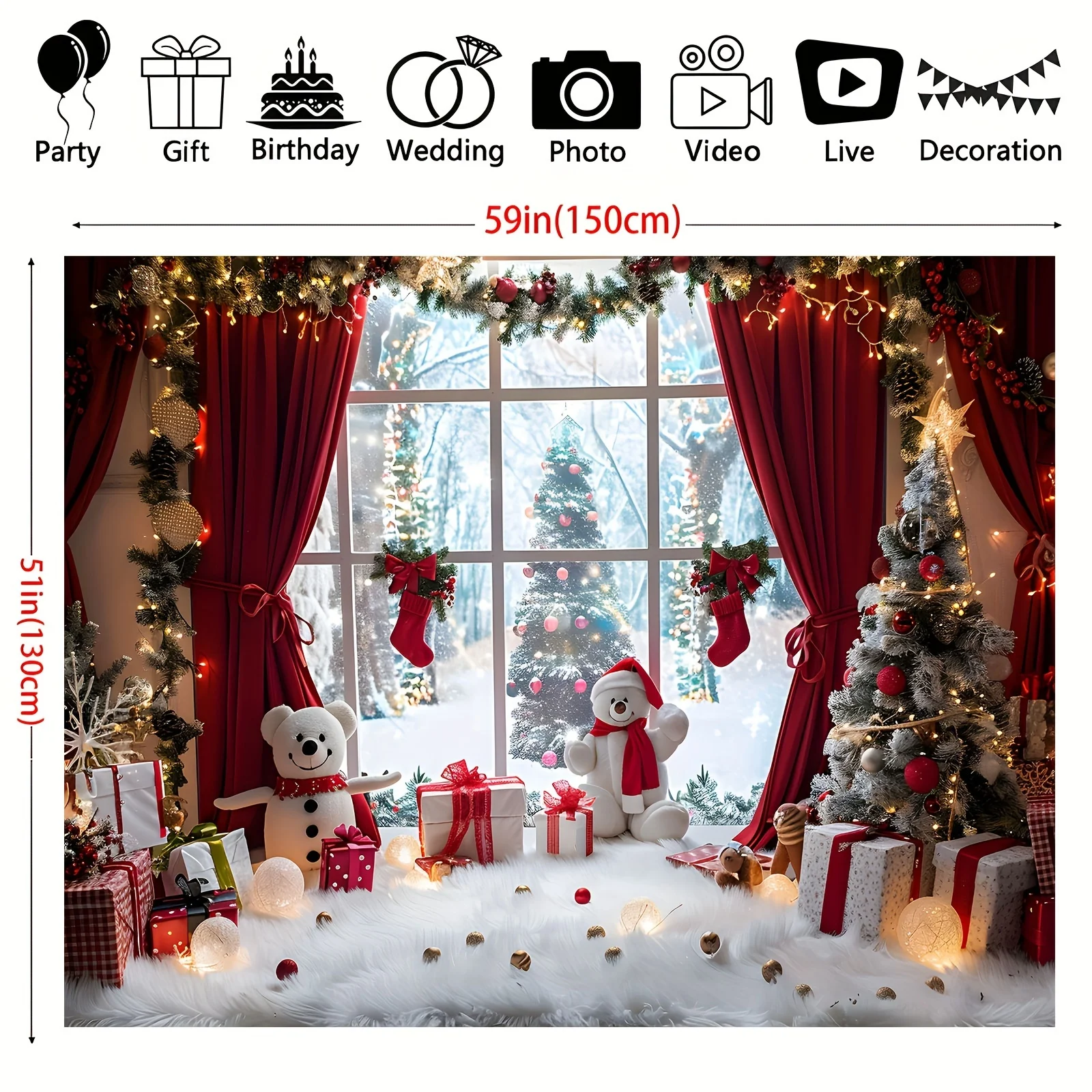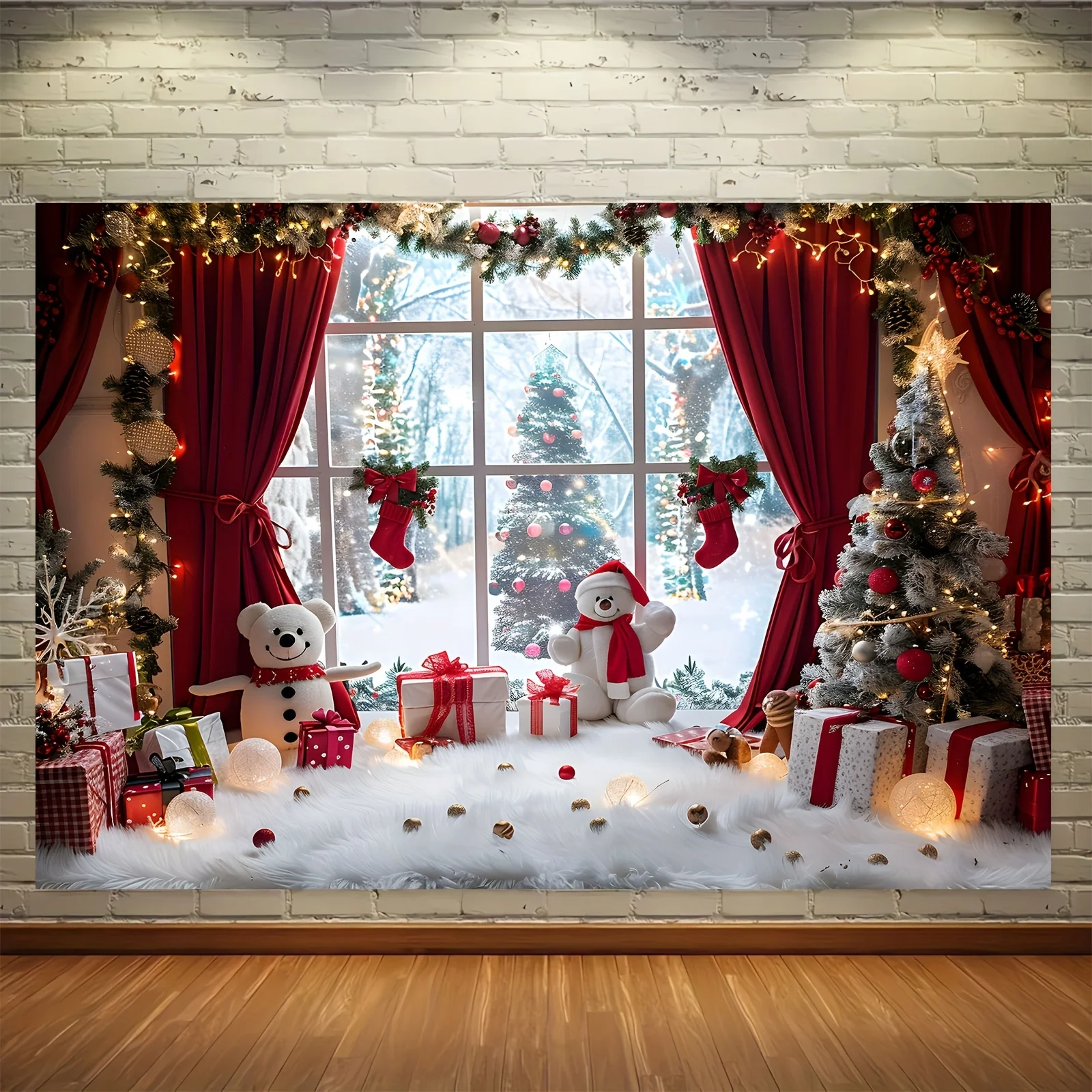 Vibrant Winter Wonderland Christmas photography background - Snowmen, Christmas trees and rural window scenes of holiday parties